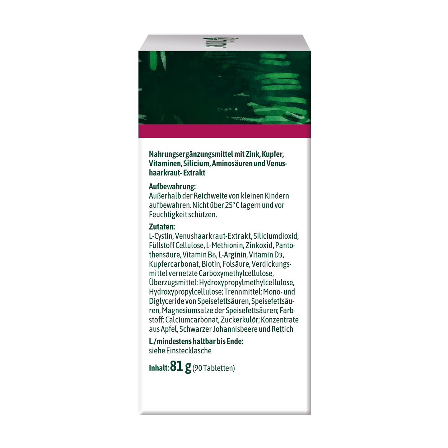 L-Cystin, Extrakt aus Venushaarkraut, Siliciumdioxid, Füllstoff Cellulose, L-Methionin, Zink, Pantothensäure, Vitamin B6, L-Arginin, Vitamin D3, Kupfer, Biotin, Folsäure, Verdickungsmittel vernetzte Carboxymethylcellulose, Überzugsmittel: Hydroxypropylmethylcellulose, Hydroxypropylcellulose; Trennmittel: Mono- und Diglyceride von Speisefettsäuren, Speisefettsäuren, Magnesiumsalze der Speisefettsäuren; Farbstoff: Calciumcarbonat, Zuckerkulör; Konzentrate aus Apfel, schwarzer Johannisbeere und Rettich -