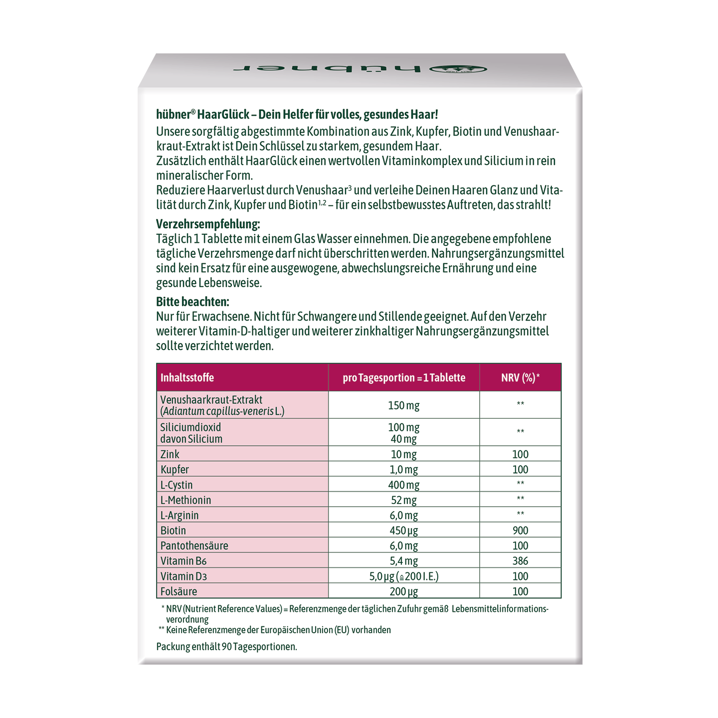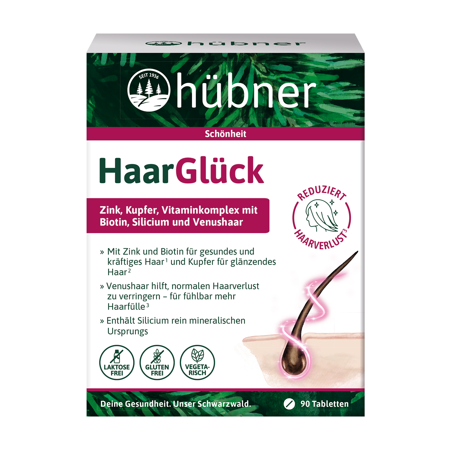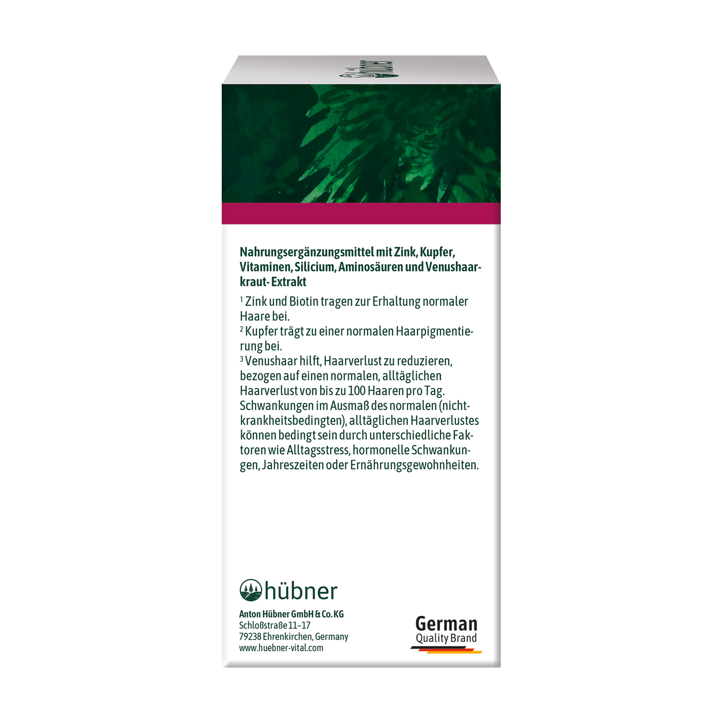Hübner® HaarGlück enthält eine einzigartige Kombination aus sinnvoll zusammengestellten Inhaltsstoffen. Diese umfasst nicht nur die wertvollen Vitamine, Zink und Kupfer, um das Haar optimal zu versorgen, sondern zusätzlich:einen Extrakt aus oberirdischen Teilen des Venushaars (Adiantum Capillus-veneris L.). Venushaar hilft, Haarverlust zu reduzieren. 3