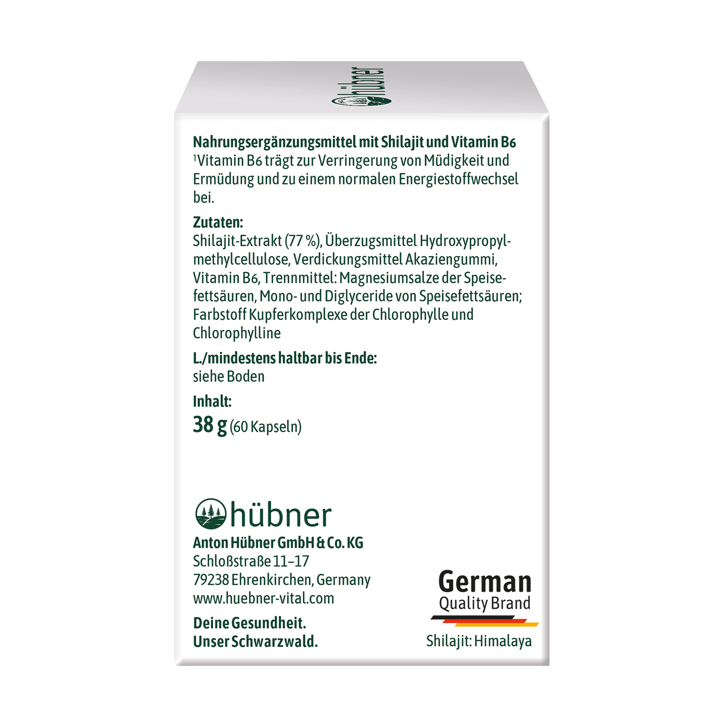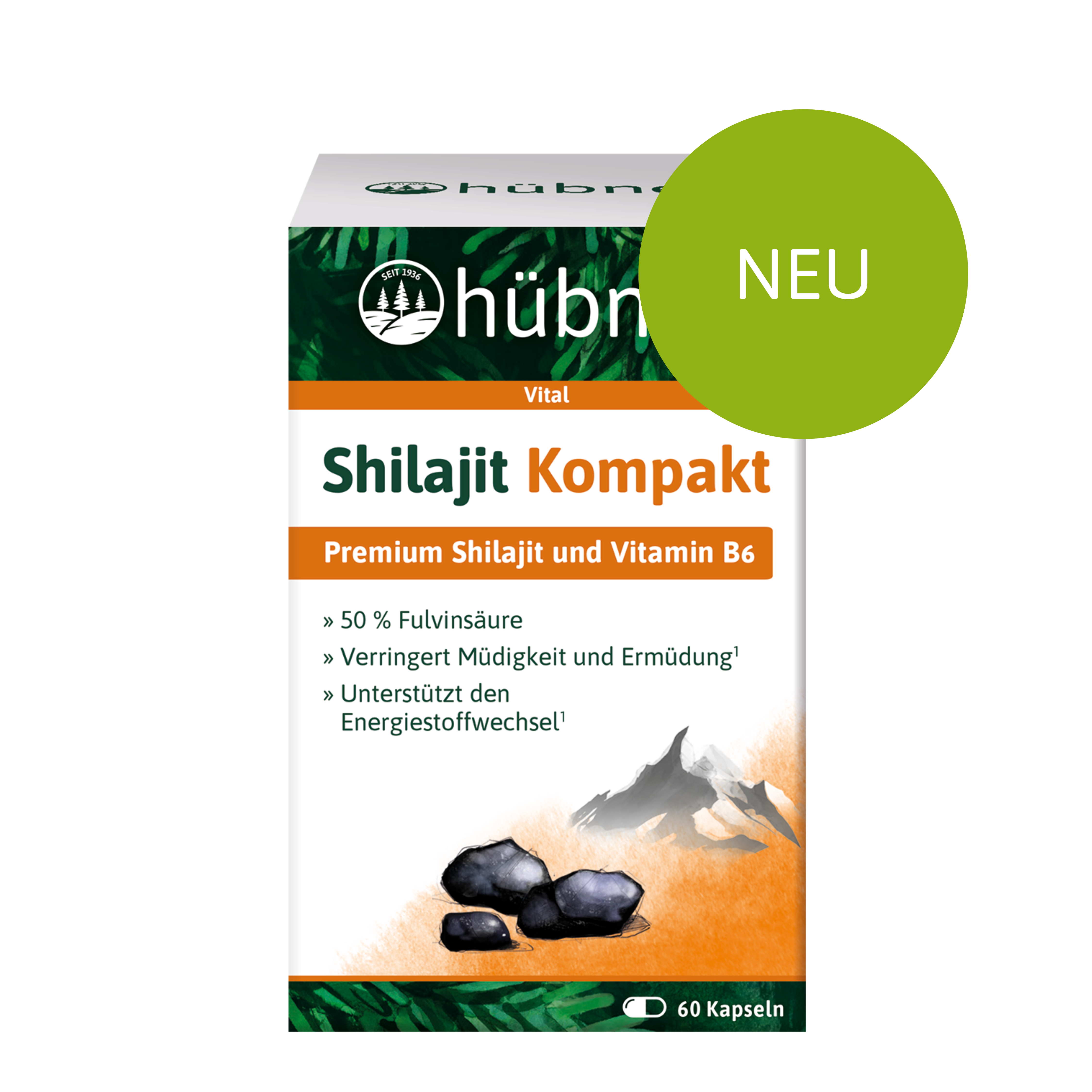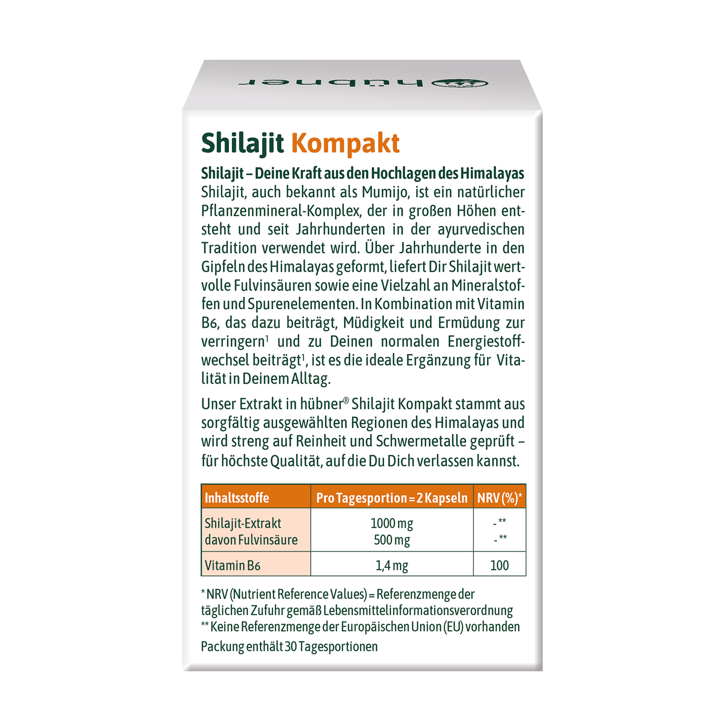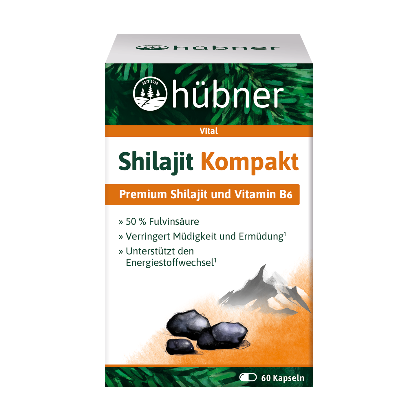 ...hübner® Shilajit Kompakt ist ein Nahrungsergänzungsmittel mit einer Kombination aus Premium Shilajit und Vitamin B6 zur Unterstützung Deines Energiestoffwechsels1 und zur Verringerung von Müdigkeit und Ermüdung1.