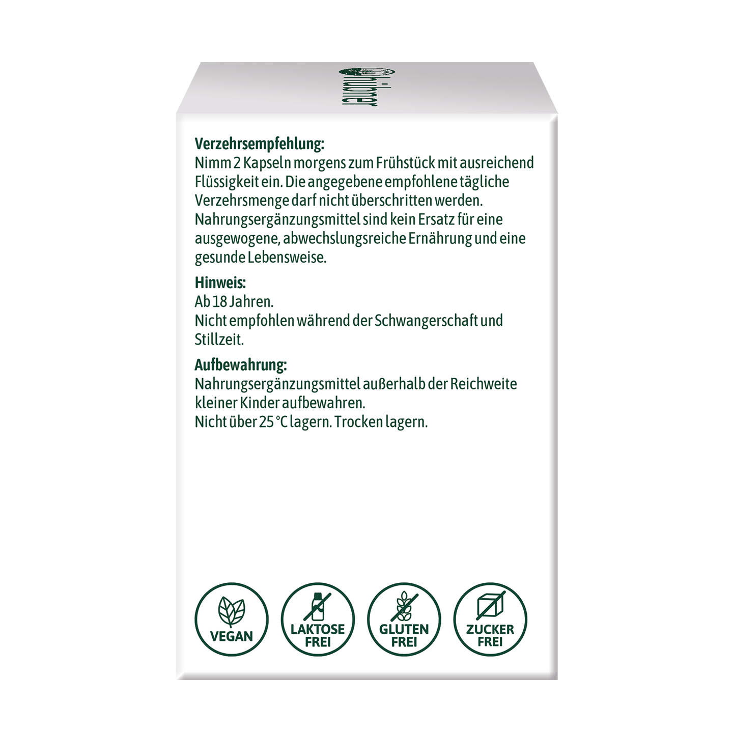 Die angegebene empfohlene tägliche Verzehrsmenge darf nicht überschritten werden. Nahrungsergänzungsmittel sind kein Ersatz für eine ausgewogene, abwechslungsreiche Ernährung und eine gesunde Lebensweise. • Hinweis: Ab 18 Jahren. Nicht empfohlen während der Schwangerschaft und Stillzeit. -