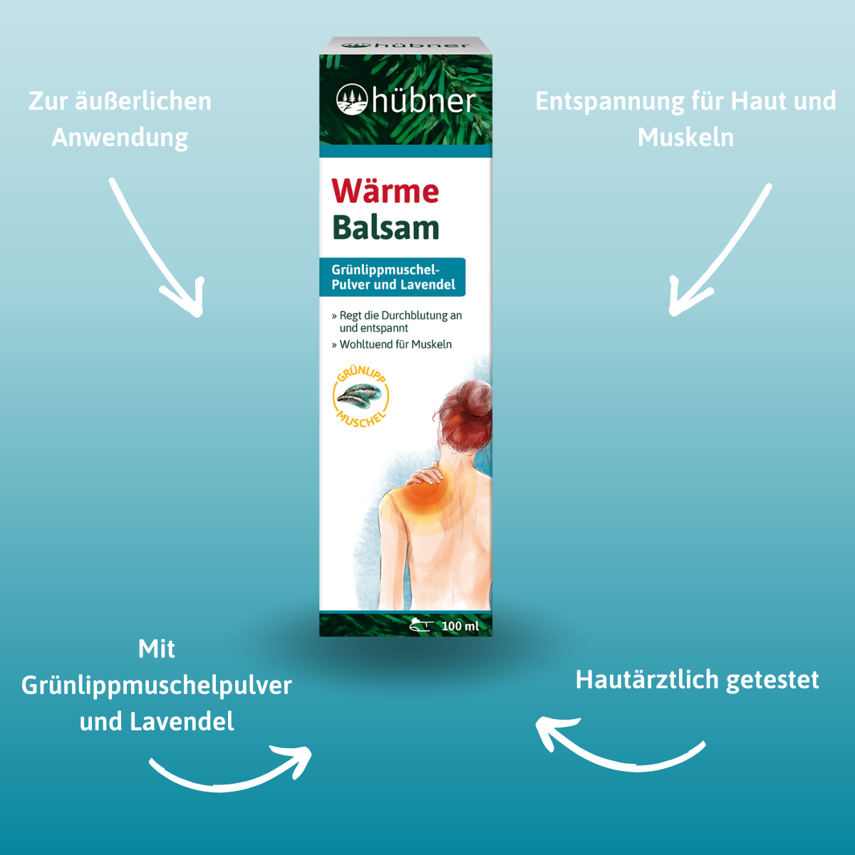 Der Wärmebalsam hübner® Wärme Balsam ist bei kältesteifen Muskeln zu empfehlen, während der hübner® Wärme Balsam eher bei Überanspruchung in Haut und Muskeln angewendet werden sollte. Diese werden meist auffällig, indem die verspannte Körperstelle heiß wird.