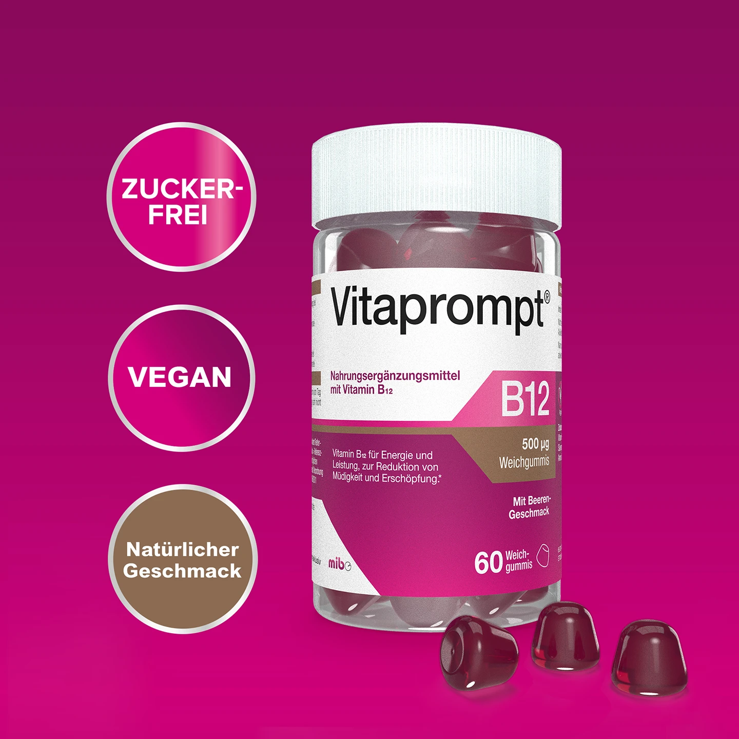 Die Vitaprompt® B12 500 μg Weichgummis liefern hochdosiertes Vitamin B12 in leckerem Beerengeschmack. Sie sind vegan, zuckerfrei sowie gluten- und laktosefrei – ideal für eine pflanzliche Ernährung und zur Unterstützung von Energie und Leistungsfähigkeit. Ein aktiver Alltag kann viel Energie kosten – besonders bei rein pflanzlicher Ernährung ist es wichtig, auf eine ausreichende Vitamin B12-Zufuhr zu achten. Die Vitaprompt® B12 500 μg Weichgummis liefern hochdosiertes Vitamin B12 in praktischer und wohlschmeckender Form. Nehmen Sie täglich einen Weichgummi – ganz ohne Wasser – ideal für unterwegs oder als feste Routine nach dem Frühstück. Besonders praktisch für Menschen, die keine Tabletten mögen und Wert auf angenehmen Geschmack legen.Warum Vitamin B12 so wichtig ist